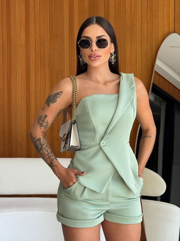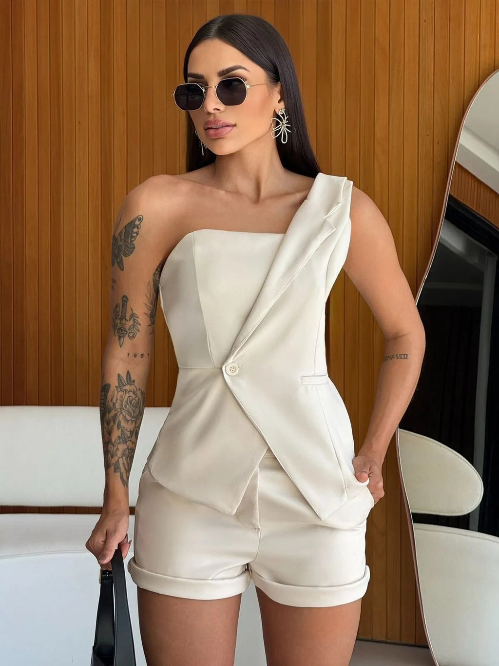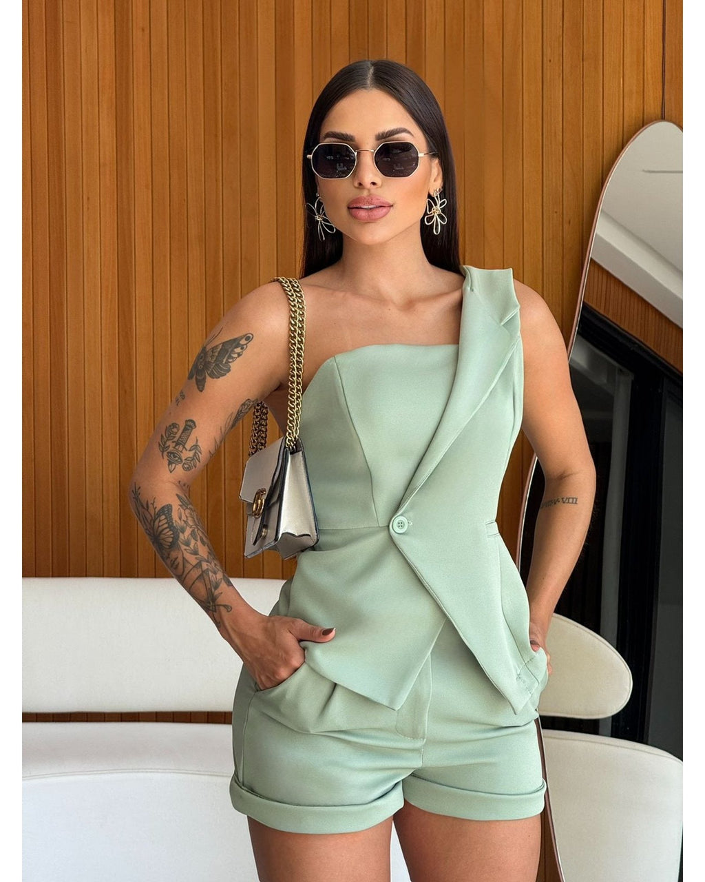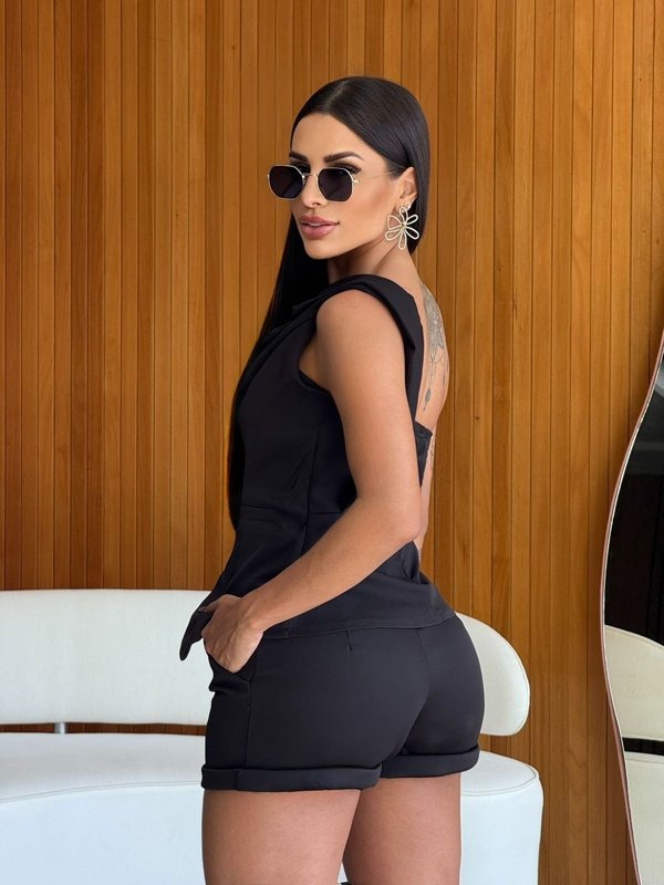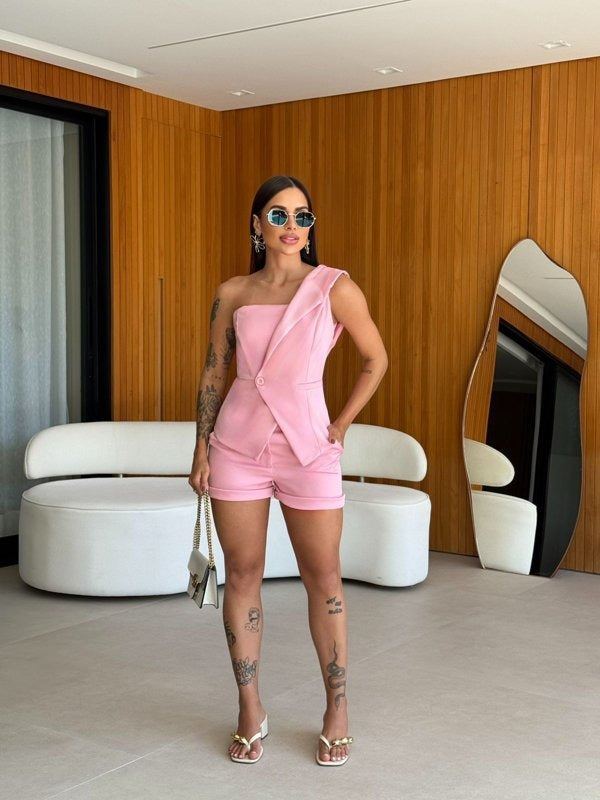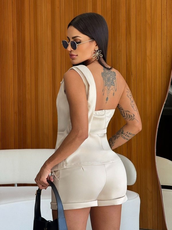 O Conjunto Edna é confeccionado em tecido de alfaiataria leve com toque macio, que garante caimento estruturado e elegante. O design moderno traz blazer sem mangas com corte assimétrico e fechamento frontal por botão, combinado com short de cintura alta e bolsos funcionais. Uma peça versátil que une sofisticação e praticidade em um único look.